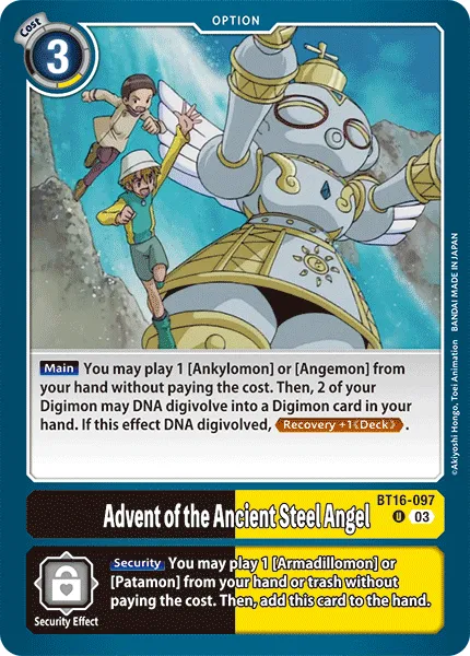 Effect: [Main] You may play 1 [Ankylomon]/[Angemon] from your hand without paying the cost. Then, 2 of your Digimon may DNA digivolve into a Digimon card in your hand. If this effect DNA digivolved, <Recovery +1 (Deck)> (Place the top card of your deck on top of your security stack)