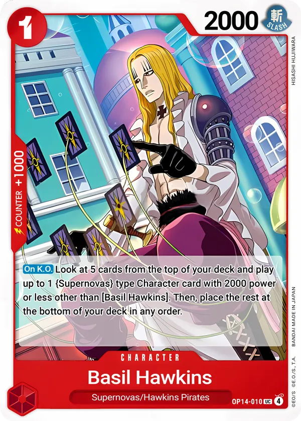 Effect: [On K.O.] Look at 5 cards from the top of your deck; play up to 1 {Supernovas} type Character card with 2000 power or less other than [Basil Hawkins]. Then, place the rest at the bottom of your deck in any order.