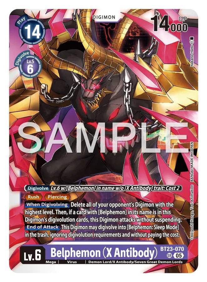 Effect: <Rush> (This Digimon can attack the turn it comes into play.) <Piercing> (When this Digimon attacks and deletes an opponent’s Digimon and survives the battle, it performs any security checks it normally would.) [When Digivolving] Delete all of your opponent’s Digimon with the highest level. Then, if a card with [Belphemon] in its name is in this Digimon’s digivolution cards, this Digimon attacks without suspending. [End of Attack] This Digimon may digivolve into [Belphemon: Sleep Mode] in the trash, ignoring digivolution requirements and without paying the cost.