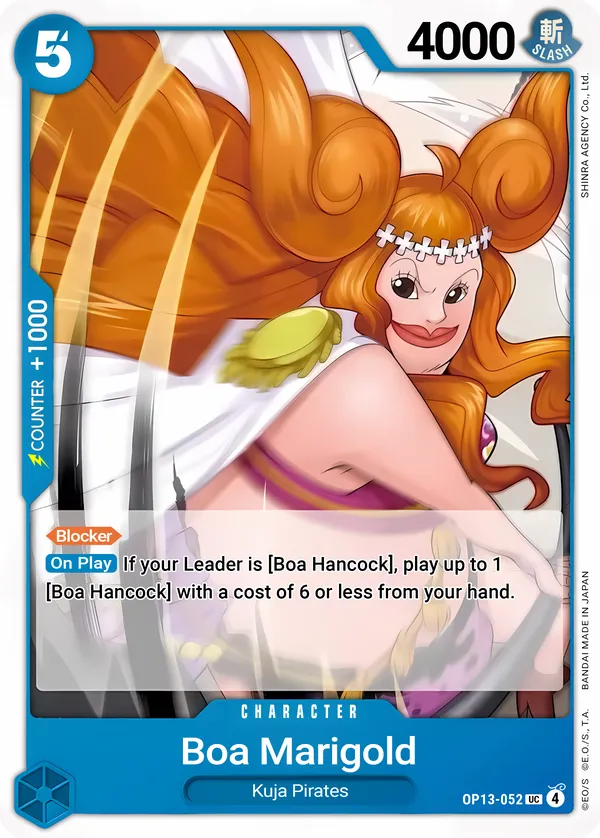 Effect: [Blocker][On Play] If your Leader is [Boa Hancock], play up to 1 [Boa Hancock] with a cost of 6 or less from your hand.