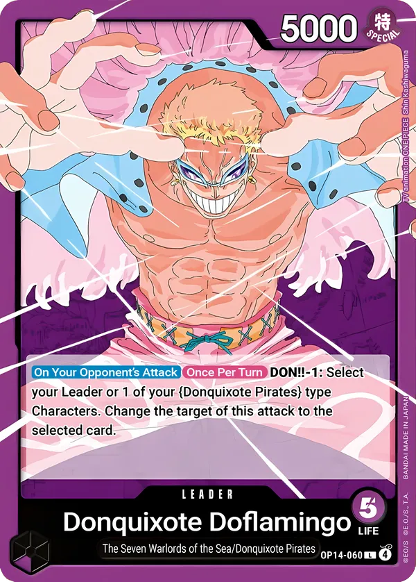 Effect: [On Your Opponent’s Attack] [Once Per Turn] DON!! −1: Select your Leader or 1 of your {Donquixote Pirates} type Characters. Change the attack target to the selected card.