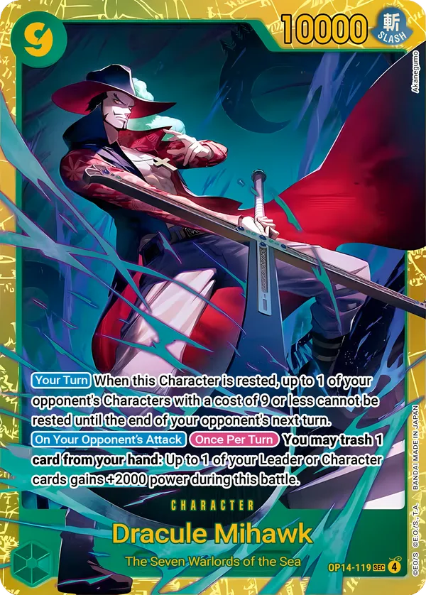 Effect: [Your Turn] When this Character becomes rested, up to 1 of your opponent’s Characters with a cost of 9 or less cannot be rested until the end of your opponent’s next End Phase.[On Your Opponent’s Attack] [Once Per Turn] You may trash 1 card from your hand: Up to 1 of your Leader or Character cards gains +2000 power during this battle.