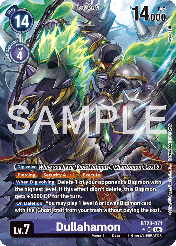 Effect: <Piercing> (When this Digimon attacks and deletes an opponent’s Digimon and survives the battle, it performs any security checks it normally would.) <Security A. +1> (This Digimon checks 1 additional security card.) <Execute> (At the end of your turn, this Digimon may attack. At the end of that attack, delete this Digimon. Your opponent’s unsuspended Digimon can also be attacked with this effect.) [When Digivolving] Delete 1 of your opponent’s Digimon with the highest level. If this effect didn’t delete, this Digimon gets +5000 DP for the turn. [On Deletion] You may play 1 level 6 or lower Digimon card with the [Ghost] trait from your trash without paying the cost.