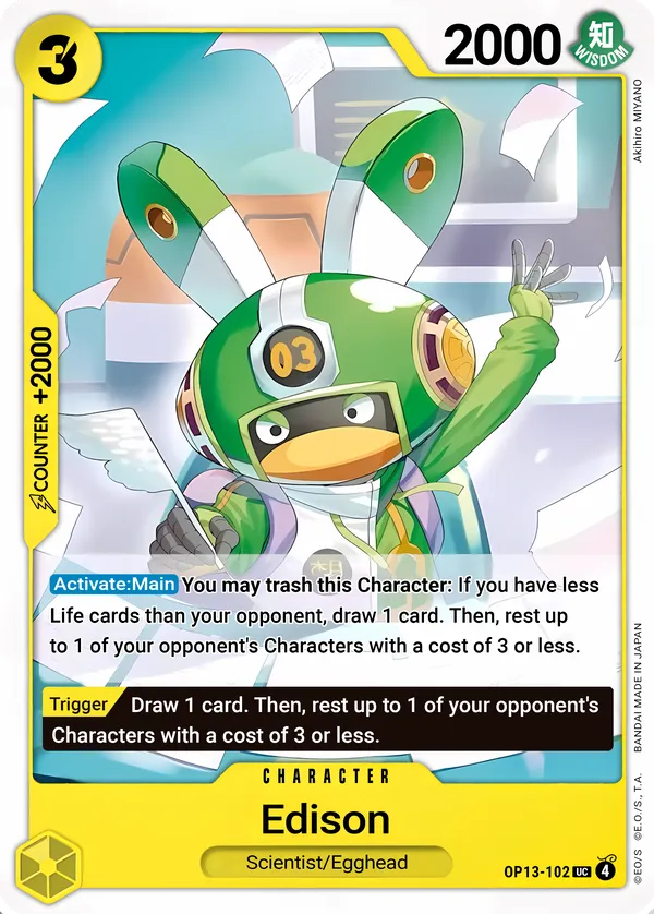 Effect: [Activate: Main] You may trash this Character: If the number of your Life cards is equal to or less than the number of your opponent’s Life cards, draw 1 card. Then, rest up to 1 of your opponent’s Characters with a cost of 3 or less.