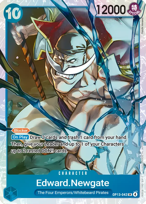 Effect: [Blocker][On Play] Draw 2 cards and trash 1 card from your hand. Then, give your Leader and 1 Character up to 2 rested DON!! cards each.