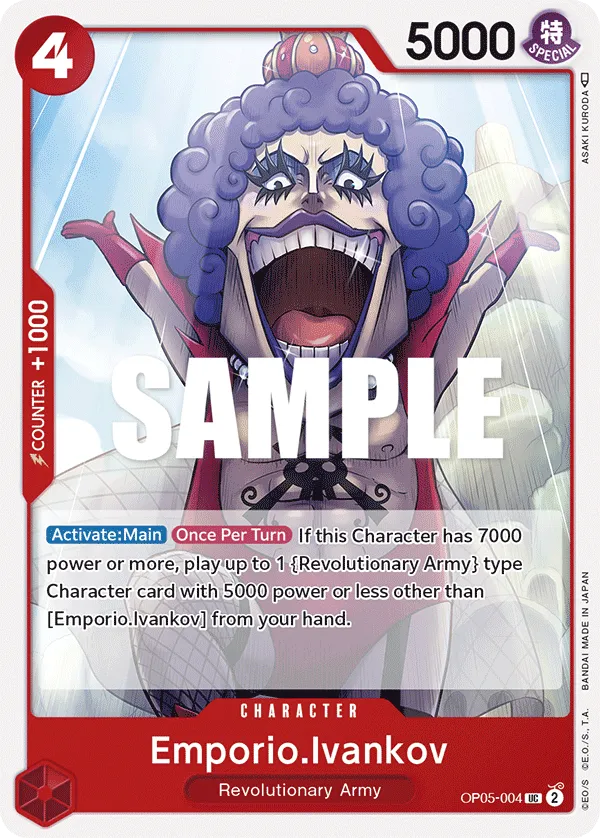 Effect: [Activate: Main] [Once Per Turn] If this Character has 7000 power or more, play up to 1 {Revolutionary Army} type Character card with 5000 power or less other than [Emporio.Ivankov] from your hand.