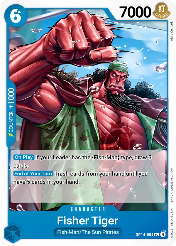Effect: [On Play] If your Leader has the {Fish-Man} type, draw 3 cards.[End of Your Turn] Trash cards from your hand until you have 5 cards in your hand.