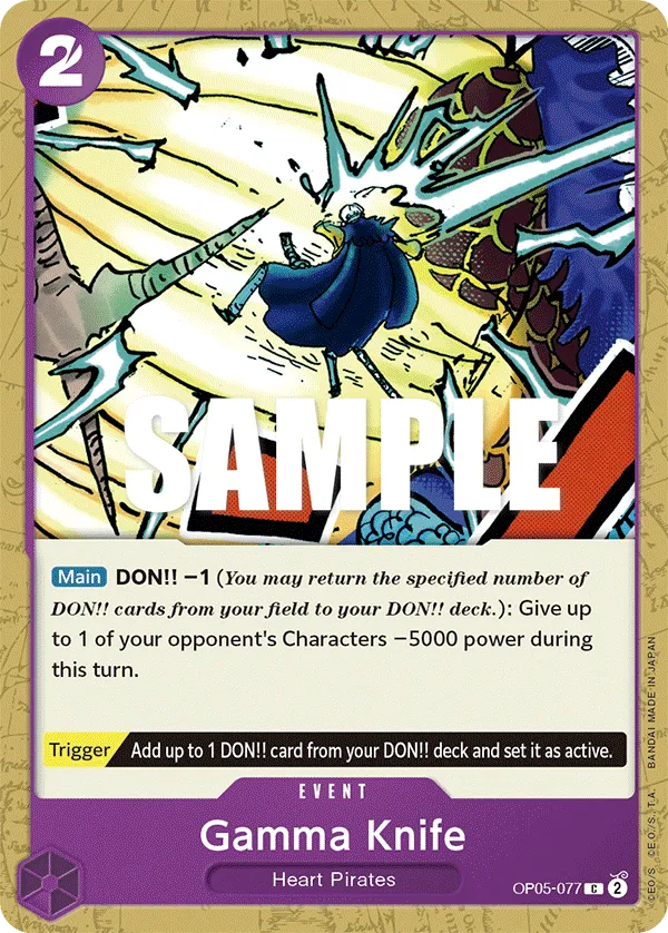 Effect: [Main] DON!! -1 (You may return the specified number of DON!! cards from your field to your DON!! deck.): Give up to 1 of your opponent’s Characters -5000 power during this turn.