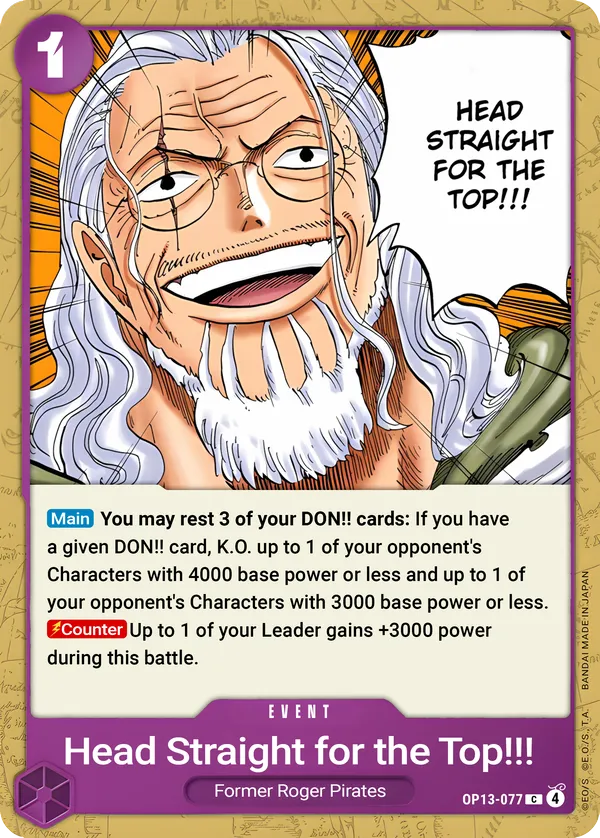 Effect: [Main] You may rest 3 of your DON!! cards: If you have any DON!! cards given, K.O. up to 1 of your opponent’s Characters with 4000 base power or less and up to 1 of your opponent’s Characters with 3000 base power or less.[Counter] Your Leader gains +3000 power during this turn.