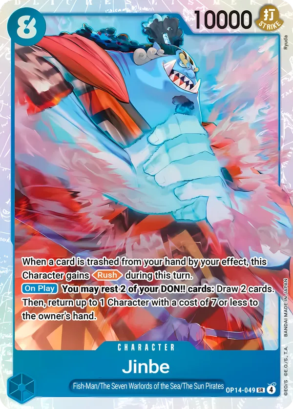 Effect: When a card is trashed from your hand by an effect, this Character gains [Rush] during this turn.[On Play] You may rest 2 of your DON!! cards: Draw 2 cards and return up to 1 Character with a cost of 7 or less to the owner’s hand.