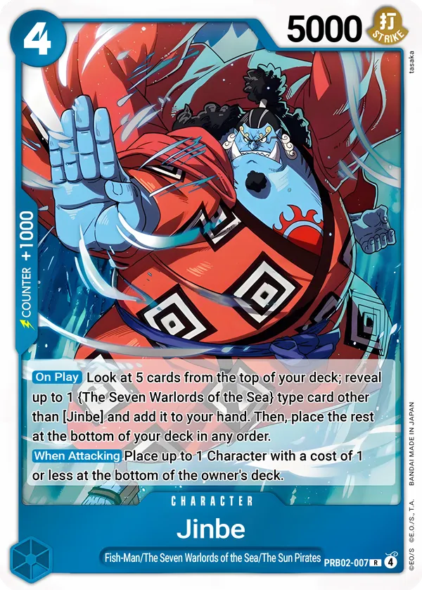 Effect: [On Play] Look at 5 cards from the top of your deck; reveal up to 1 {The Seven Warlords of the Sea} type card other than [Jinbe] and add it to your hand. Then, place the rest at the bottom of your deck in any order. [When Attacking] Place up to 1 Character with a cost of 1 or less at the bottom of the owner’s deck.