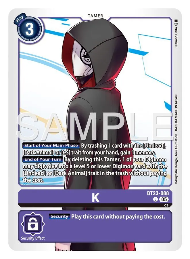 Effect: [Start of Your Main Phase] By trashing 1 card with the [Undead], [Dark Animal] or [CS] trait from your hand, gain 1 memory. [End of Your Turn] By deleting this Tamer, 1 of your Digimon may digivolve into a level 5 or lower Digimon card with the [Undead] or [Dark Animal] trait in the trash without paying the cost.
