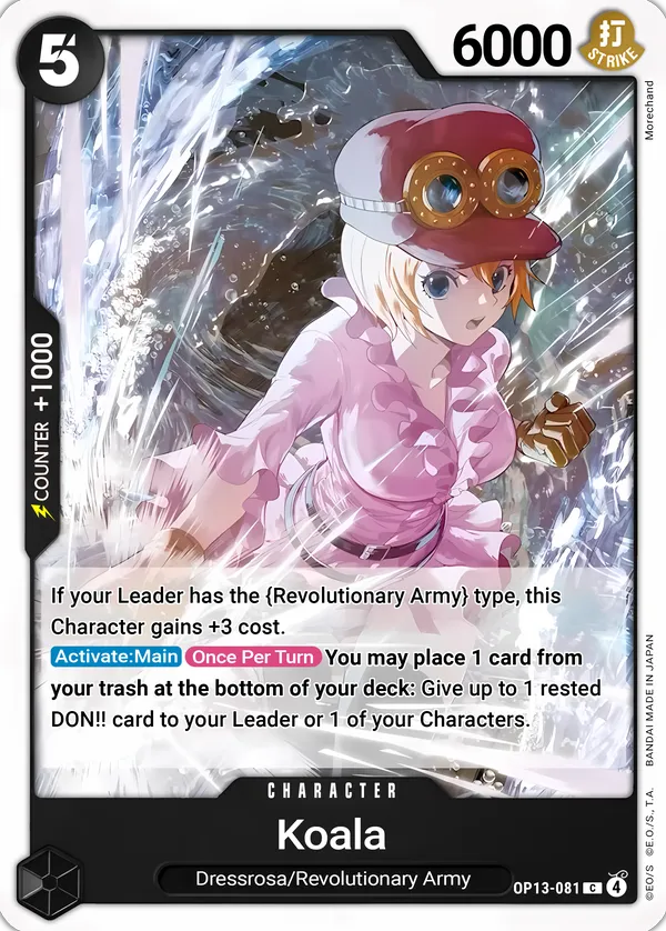 Effect: If your Leader has the {Revolutionary Army} type, this Character gains +3 cost.[Activate: Main] [Once Per Turn] You may place 1 card from your trash at the bottom of your deck: Give up to 1 rested DON!! card to your Leader or 1 of your Characters.