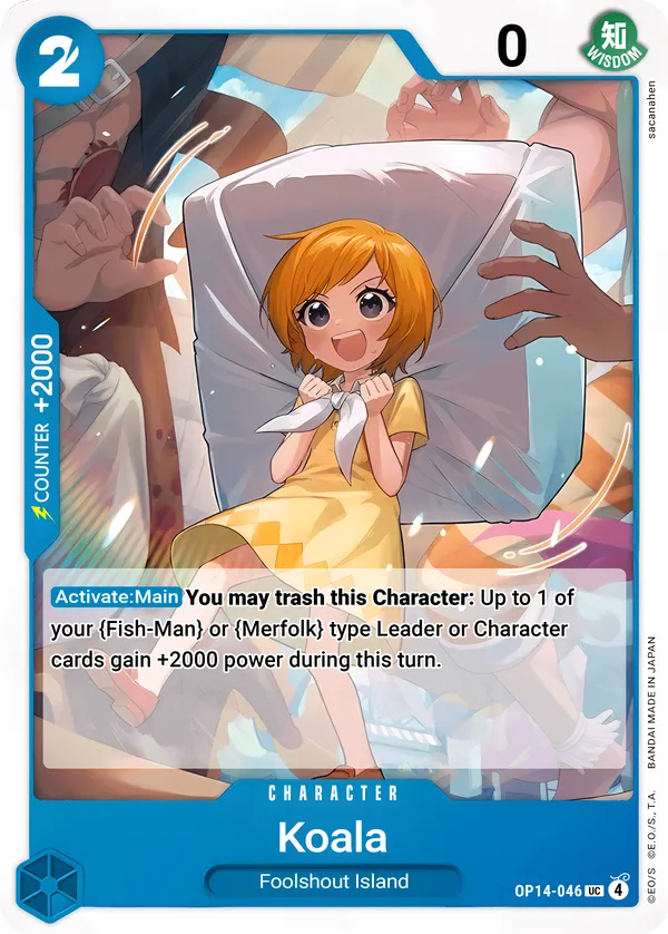 Effect: [Activate: Main] You may trash this Character: Up to 1 of your {Fish-Man} or {Merfolk} type Leader or Character cards gains +2000 power during this turn.