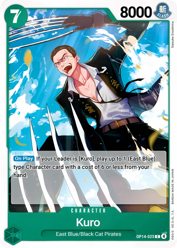 Effect: [On Play] If your Leader is [Kuro], play up to 1 {East Blue} type Character card with a cost of 6 or less from your hand.