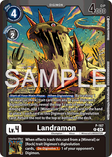 Effect: [Start of Your Main Phase] [When Digivolving] By trashing 1 [Mineral] or [Rock] trait card from any of your Digimon’s digivolution cards, reveal the top 3 cards of your deck. Among them, add 1 [Mineral] or [Rock] trait card to the hand, or place 1 such card as this Digimon’s bottom digivolution card. Return the rest to the top or bottom of the deck.