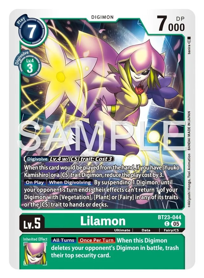 Effect: When this card would be played from the hand, if you have [Yuuko Kamishiro] or a [CS] trait Digimon, reduce the play cost by 3. [On Play] [When Digivolving] By suspending 1 Digimon, until your opponent’s turn ends, their effects can’t return 1 of your Digimon with [Vegetation], [Plant] or [Fairy] in any of its traits or the [CS] trait to hands or decks.