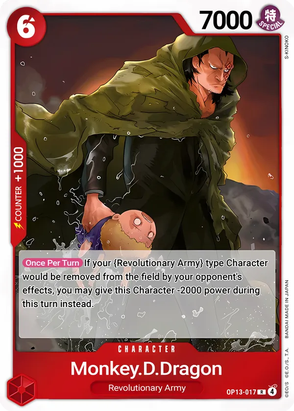 Effect: [Once Per Turn] If your {Revolutionary Army} type Character would be removed from the field by your opponent’s effect, you may give this Character −2000 power during this turn instead.