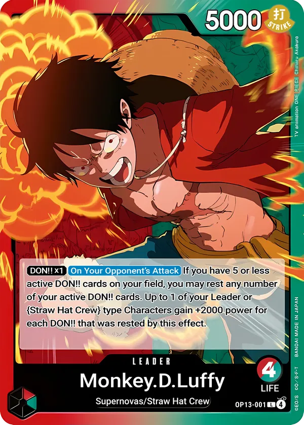 Effect: [DON!! x1] [On Your Opponent’s Attack] If you have 5 or less active DON!! cards, you may rest any number of your DON!! cards. For every DON!! card rested this way, this Leader or up to 1 of your {Straw Hat Crew} type Characters gains +2000 power during this battle.