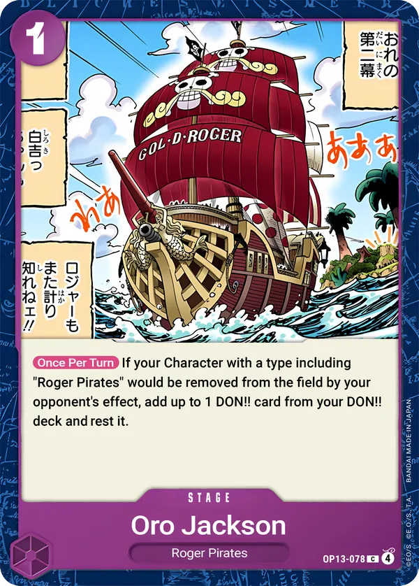 Effect: [Once Per Turn] When your Character with a type including “Roger Pirates” is removed from the field by your opponent’s effect, add up to 1 DON!! card from your DON!! deck and rest it.