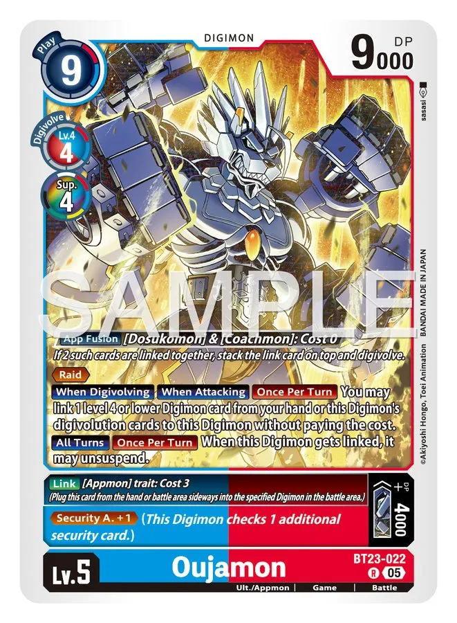 Effect: <Raid> (When this Digimon attacks, you may switch the target of attack to 1 of your opponent’s unsuspended Digimon with the highest DP.) [When Digivolving] [When Attacking] [Once Per Turn] You may link 1 level 4 or lower Digimon card from your hand or this Digimon’s digivolution cards to this Digimon without paying the cost. [All Turns] [Once Per Turn] When this Digimon gets linked, it may unsuspend.