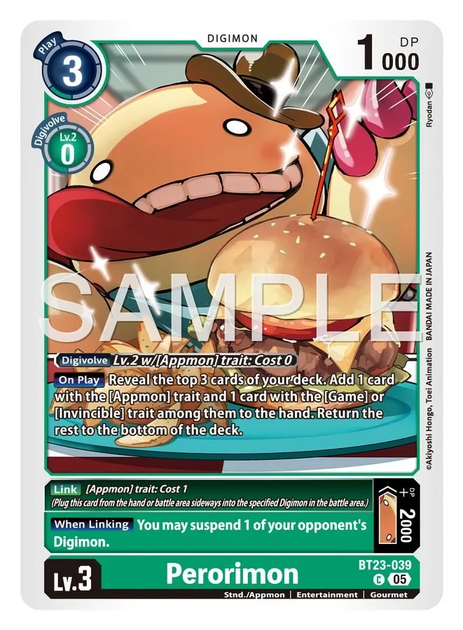 Effect: [On Play] Reveal the top 3 cards of your deck. Add 1 card with the [Appmon] trait and 1 card with the [Game] or [Invincible (App Name)] trait among them to the hand. Return the rest to the bottom of the deck.