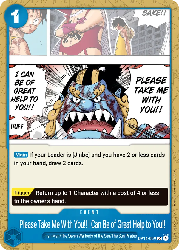 Effect: [Main] If your Leader is [Jinbe] and you have 2 or less cards in your hand, draw 2 cards.