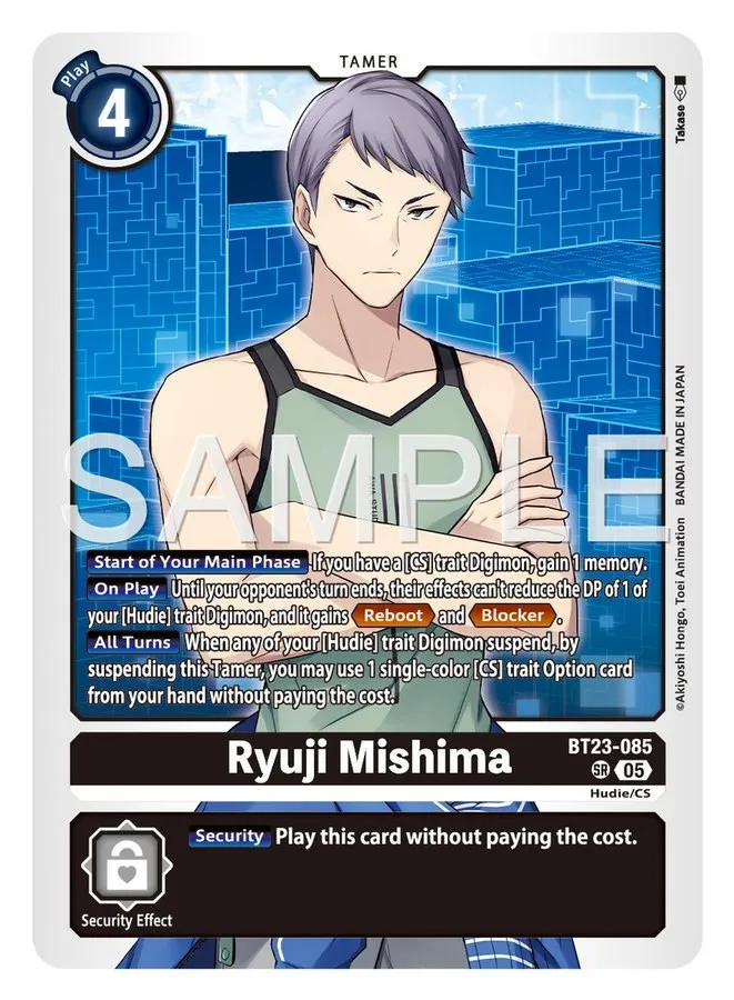 Effect: [Start of Your Main Phase] If you have a [CS] trait Digimon, gain 1 memory. [On Play] Until your opponent’s turn ends, their effects can’t reduce the DP of 1 of your [Hudie] trait Digimon, and it gains <Reboot> (Unsuspend this Digimon during your opponent’s unsuspend phase.) and <Blocker> (This Digimon can block in the blocker timing.). [All Turns] When any of your [Hudie] trait Digimon suspend, by suspending this Tamer, you may use 1 single-color [CS] trait Option card from your hand without paying the cost.