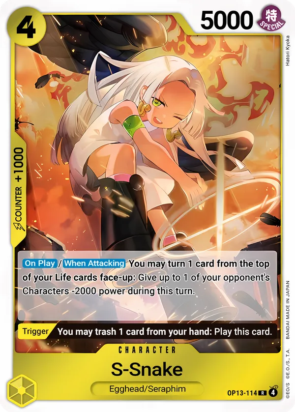 Effect: [On Play]/[When Attacking] You may turn 1 card from the top of your Life cards face-up: Give up to 1 of your opponent’s Characters −2000 power during this turn.