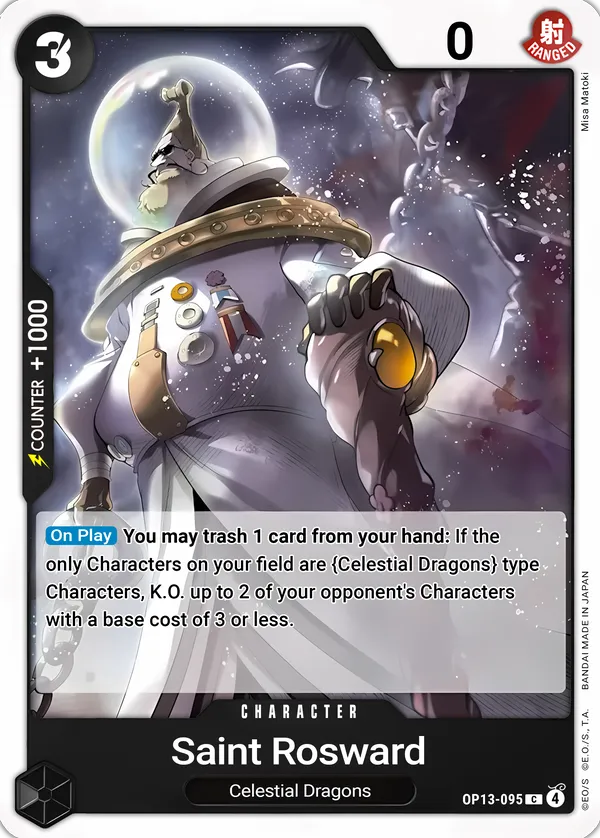 Effect: [On Play] You may trash 1 card from your hand: If you only have {Celestial Dragons} type Characters, K.O. up to 2 of your opponent’s Characters with a base cost of 3 or less.