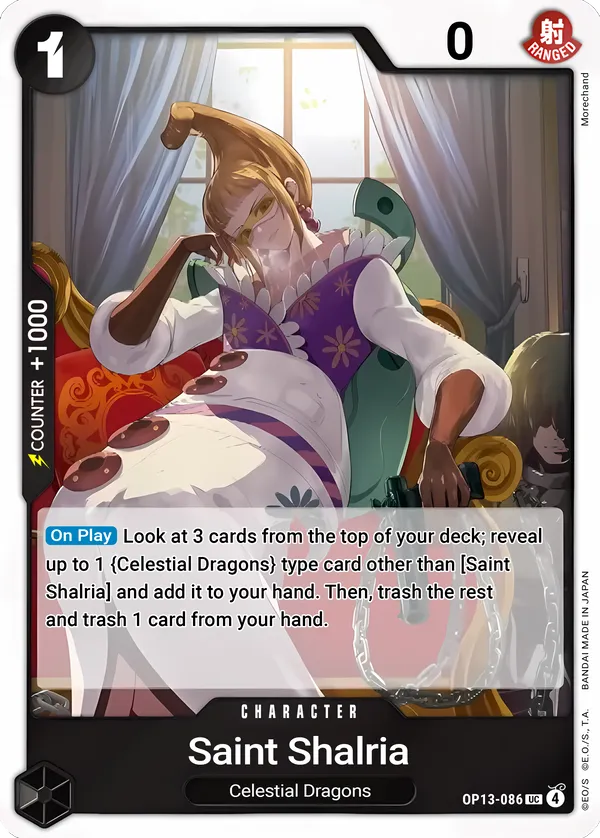 Effect: [On Play] Look at 3 cards from the top of your deck; reveal up to 1 {Celestial Dragons} type card other than [Saint Shalria] and add it to your hand. Then, trash the rest and trash 1 card from your hand.