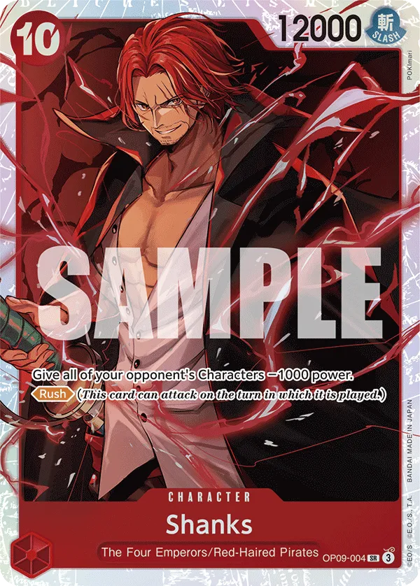 Effect: Give all of your opponent’s Characters −1000 power.[Rush] (This card can attack on the turn in which it is played.)