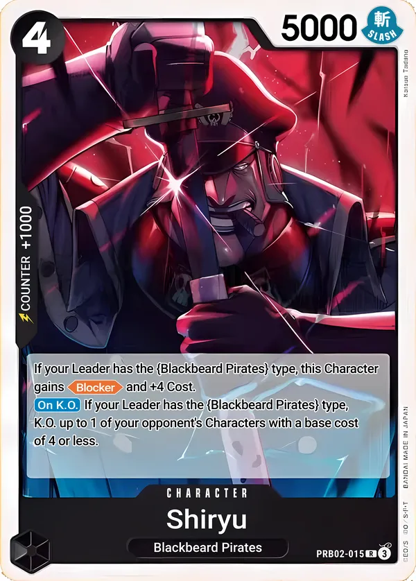 Effect: If your Leader has the {Blackbeard Pirates} type, this Character gains and +4 cost. [On K.O.] If your Leader had the {Blackbeard Pirates} type, K.O. up to 1 of your opponent’s Characters with a base cost of 4 or less.