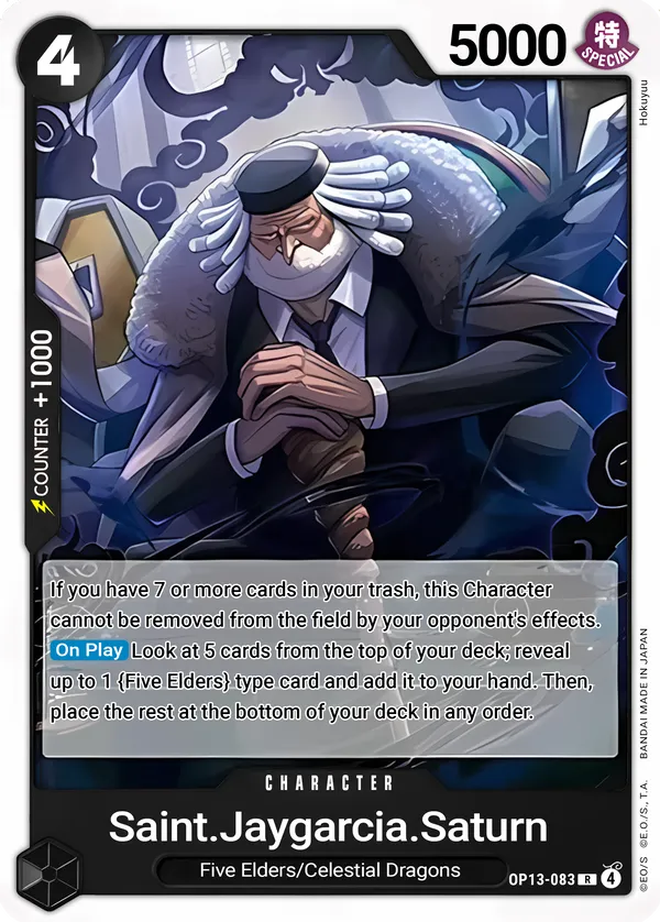 Effect: If you have 7 or more cards in your trash, this Character cannot be removed from the field by your opponent’s effects.[On Play] Look at 5 cards from the top of your deck; reveal up to 1 {Five Elders} type card and add it to your hand. Then, place the rest at the bottom of your deck in any order.
