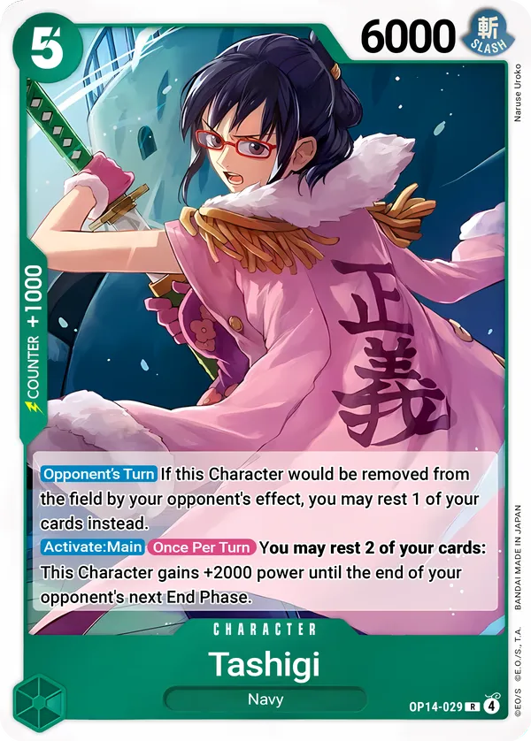 Effect: [Opponent’s Turn] If this Character would be removed from the field by your opponent’s effect, you may rest 1 of your cards instead.[Activate: Main] [Once Per Turn] You may rest 2 of your cards: This Character gains +2000 power until the end of your opponent’s next End Phase.
