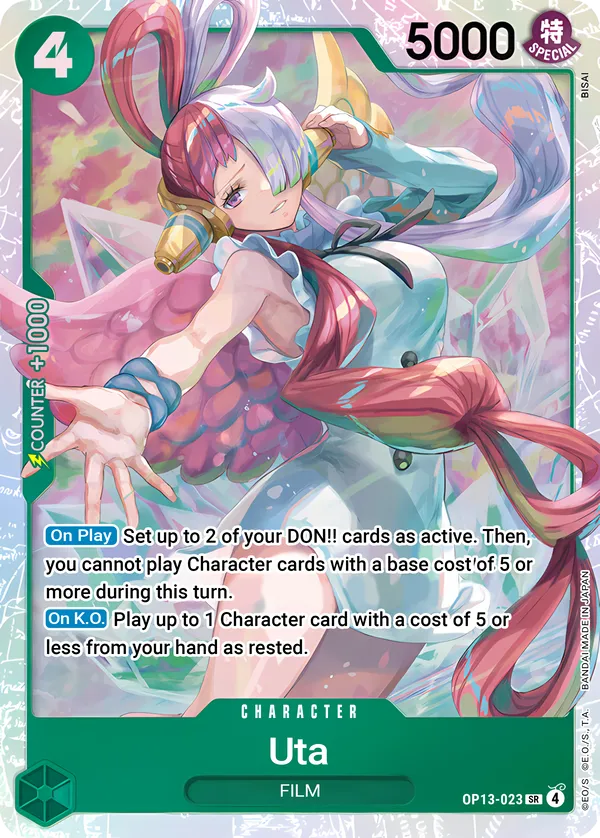 Effect: [On Play] Set up to 2 of your DON!! cards as active. Then, you cannot play Character cards with a base cost of 5 or more during this turn.[On K.O.] Play up to 1 Character card with a cost of 5 or less from your hand rested.