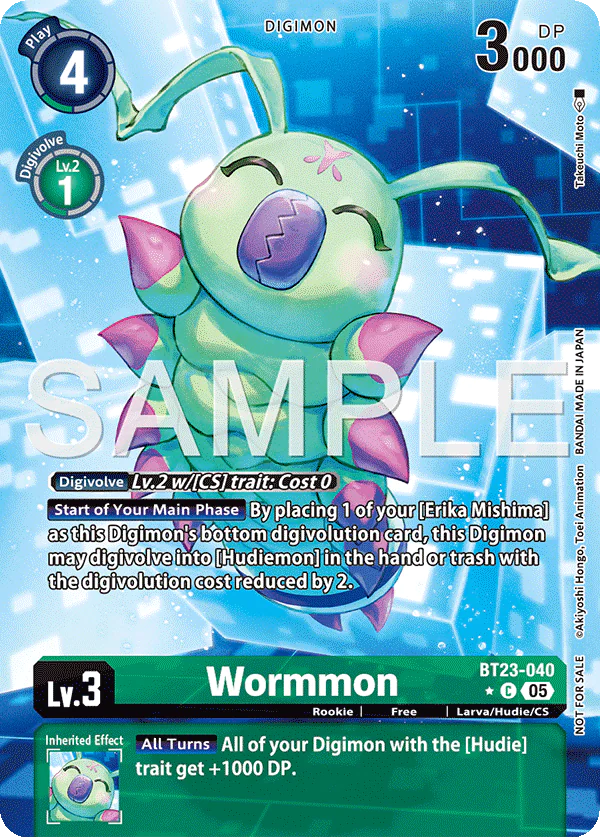 Effect: [Start of Your Main Phase] By placing 1 of your [Erika Mishima] as this Digimon’s bottom digivolution card, this Digimon may digivolve into [Hudiemon] in the hand or trash with the digivolution cost reduced by 2.