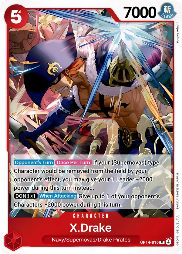 Effect: [Opponent’s Turn] [Once Per Turn] If your {Supernovas} type Character would be removed from the field by your opponent’s effect, you may give your Leader −2000 power during this turn instead.[DON!! x1] [When Attacking] Give up to 1 of your opponent’s Characters −2000 power during this turn.